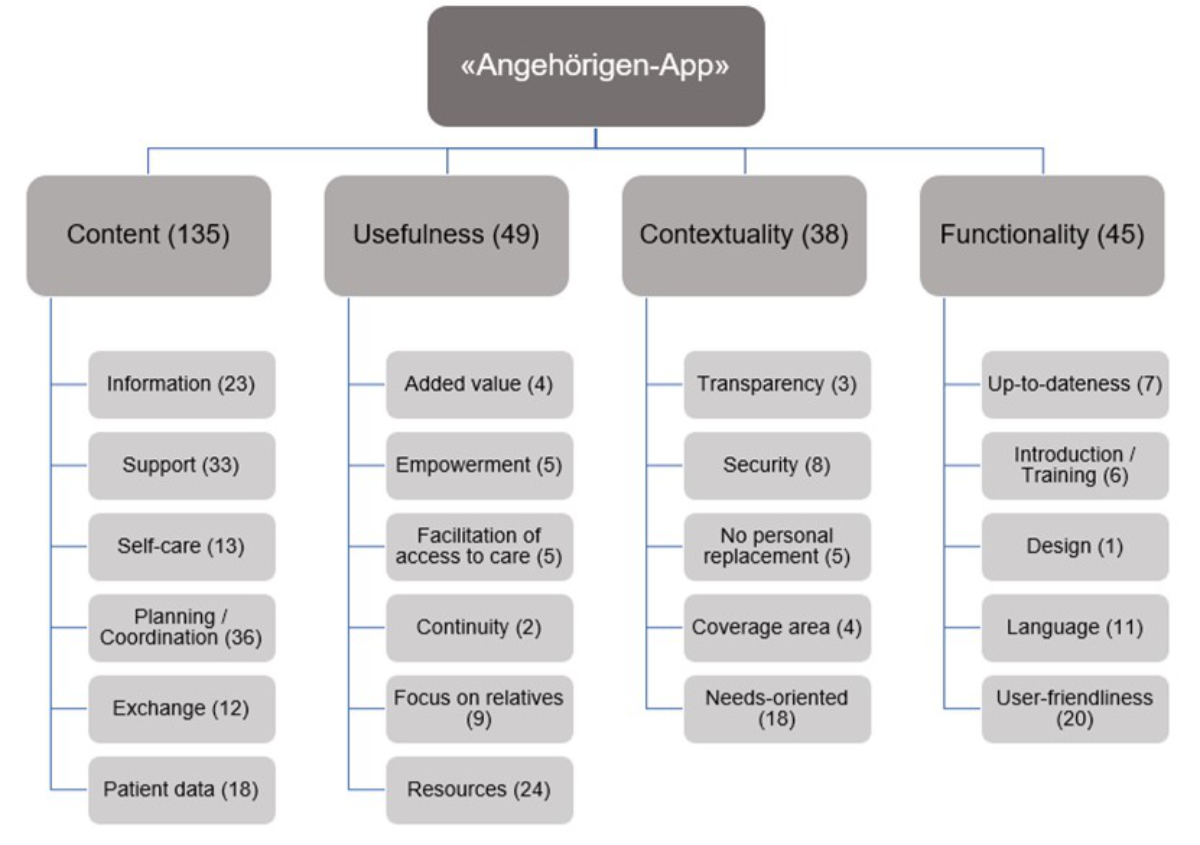 Figure 1Category system “Angehörigen-App”. The simplified category system developed from the statements of the focus groups, with the four main categories and corresponding subcategories. The number of text passages in which the categories were mentioned is written in brackets. Not shown in this figure is a residual category containing 20 irrelevant text passages.