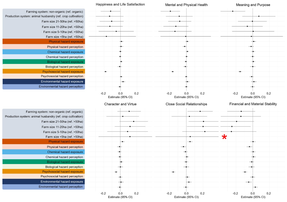 In conclusion, this cohort study provides valuable insights into farmers’ wellbeing in Switzerland. The findings highlight the burden of psychological distress in Swiss farming communities and the association between exposure to psychosocial hazards and decreased flourishing. Our results further suggest that non-organic and organic farmers, as well as farms of different sizes, face different occupational pressures that may affect human flourishing. Further studies are warranted to investigate the wellbeing of specific subgroups, e.g. women and migrant workers, and to identify occupational hazards and farm-level characteristics most relevant to farmers’ wellbeing. Qualitative and mixed-method approaches can additionally aid in designing adequate mental health strategies for the Swiss farming population and specific farm settings.