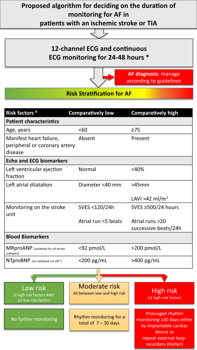 In this flow chart, we propose a pragmatic algorithm for atrial fibrillation monitoring after ischaemic stroke or TIA. The individual components of the decision algorithm (low or high pre-test probability for detecting atrial fibrillation) are based on observational studies. The biomarkers are collinear and the proposed decision-making process as a whole has not yet been validated. Ongoing studies will clarify whether intensified rhythm monitoring in patients with recent ischaemic stroke leads to a decrease in recurrent thromboembolism (e.g. NCT04371055).
