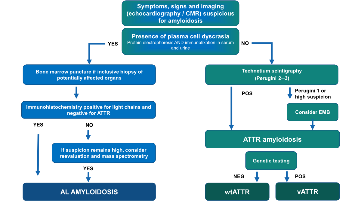 When signs and symptoms, ECG and echocardiography (or CMR) are suggestive of cardiac amyloidosis, further testing is indicated to (a) diagnose cardiac amyloidosis and (b) determine the subtype of cardiac amyloidosis. Until recently, cardiac amyloidosis was only diagnosed by a positive biopsy, but accumulating literature supports the notion that cardiac scintigraphy with bone-avid tracers (DPD, HMDP or PYP) can non-invasively diagnose the disease [20]. However, certain limitations need to be considered: