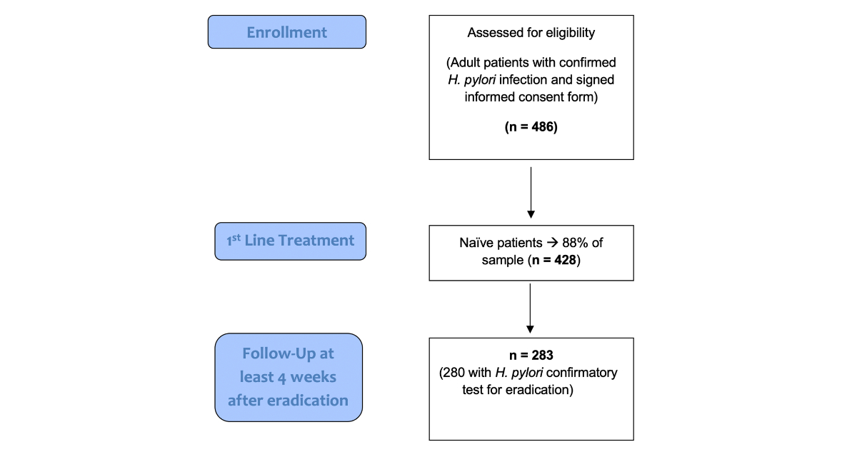Criteria for country selection, national coordinators, and gastroenterologists acting as recruiting investigators are reported in the protocol [14]. The main criterion for the eligible investigators was that they were gastroenterologists managing patients with Helicobacter pylori infection. All adult patients diagnosed with Helicobacter pylori infection and receiving empirical eradication therapy were included. The main outcome – confirmed eradication – required a valid confirmatory test (e.g. a urea breath test or stool antigen test) at least four weeks after treatment. Cases without follow-up confirmatory test results were excluded from the effectiveness analysis, resulting in a reduced cohort for statistical evaluation.
