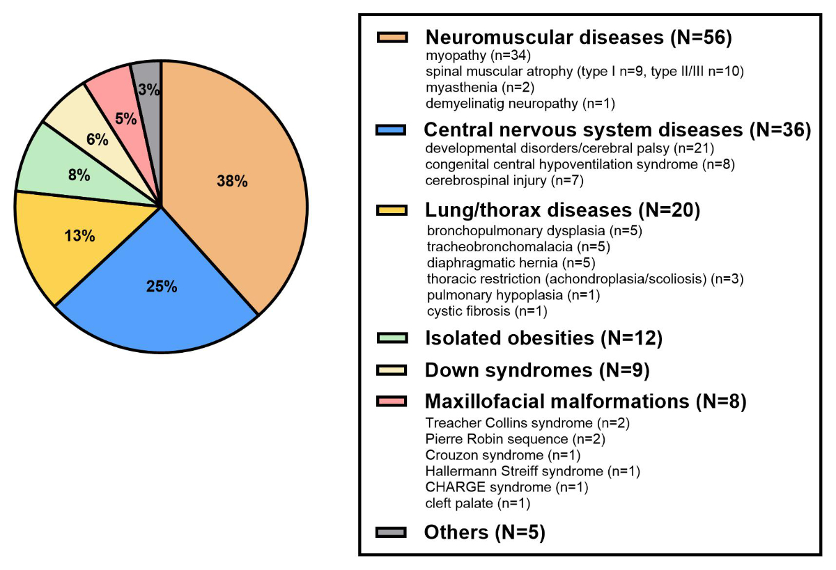 The patients presented a large spectrum of underlying medical conditions, the most common being related to neuro-muscular and central nervous system diseases (figure 2). Breathing disorder mechanisms leading to home respiratory support were upper airway obstruction (n = 52, 36%), pump failure (n = 44, 30%), central breathing control anomaly (n = 17, 12%), lower airway obstruction (n = 12, 8%) or mixed (n = 21, 14%).