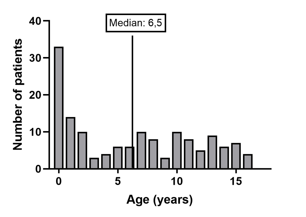 The median (range) age at home respiratory support initiation was 6.5 years (0.0–16.5; figure 3). There was a peak of incidence in the first year of life (n = 35), including congenital central hypoventilation syndrome (CCHS; n = 5), congenital myopathy (n = 5), severe neurological impairment (n = 5), bronchopulmonary dysplasia (n = 4), diaphragmatic hernia (n = 4), craniofacial malformations (n = 3), VACTERL association (Vertebral, Anorectal, Cardiovascular, Tracheal, Esophageal, Renal, Limb) (n = 3), spinal muscular atrophy (SMA; n = 2), thoracic restrictions (n = 2), Down syndrome (n = 1) and tracheomalacia (n = 1).