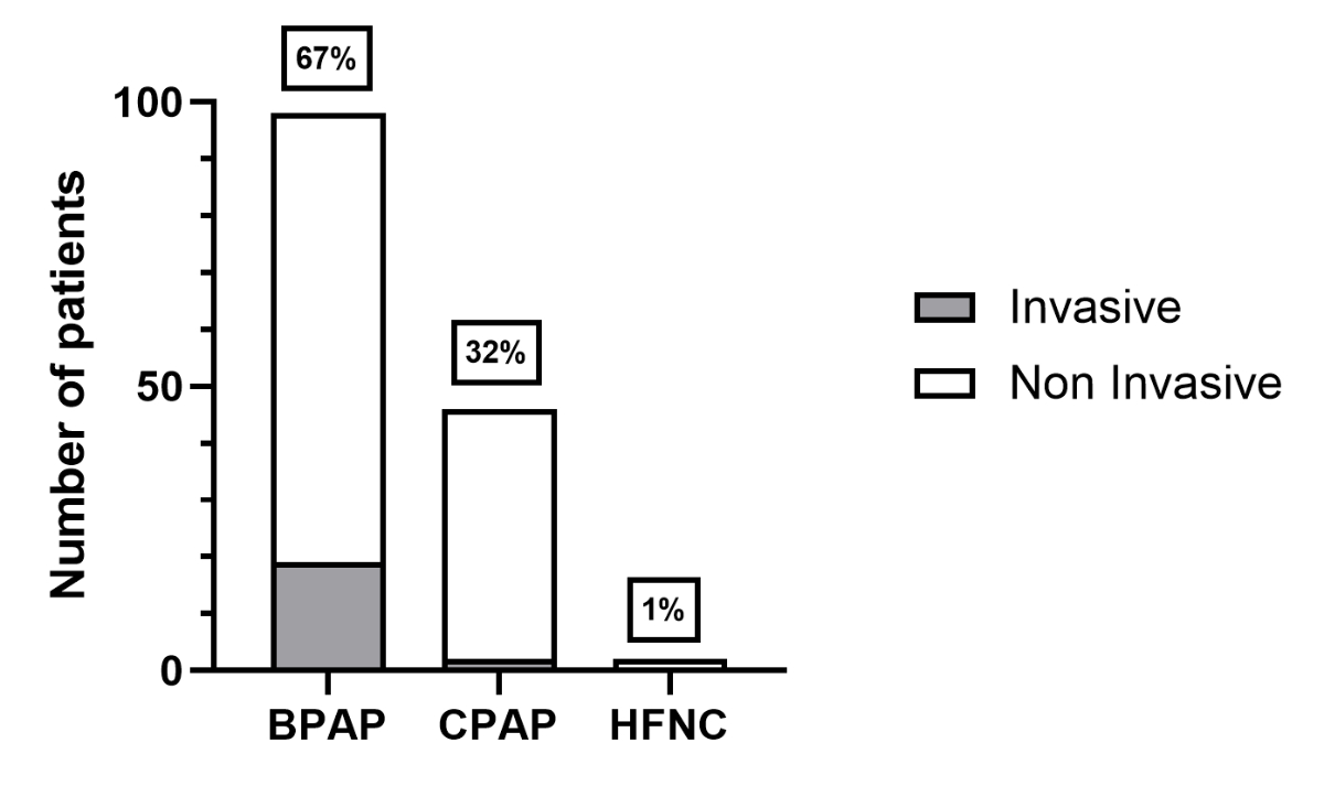 | BPAP (n = 19) | CPAP (n = 2) | BPAP (n = 79) | CPAP (n = 44) | High flow nasal cannula (n = 2) | |||