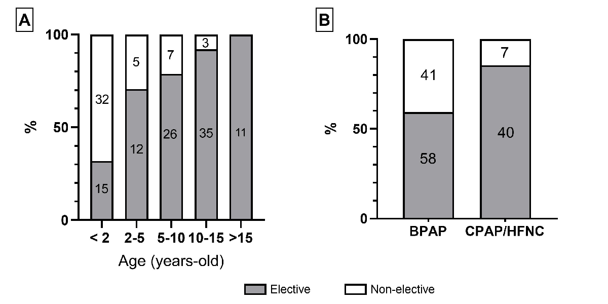 Figure 6Elective versus non-elective context for home respiratory support (HRS) initiation by (A) age at HRS initiation and (B) HRS type (no missing data). The numbers in column boxes are the absolute numbers of patients for each category.