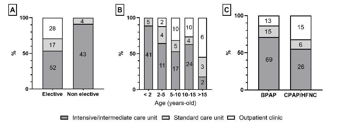 Home respiratory support was initiated electively in 99 (68%) patients, with the proportion increasing with age and greater for CPAP/high flow nasal cannula than BPAP (figure 6). Non-elective initiations (n = 47, 32%) were related to the failure of respiratory support weaning after an acute respiratory exacerbation (n = 23), neonatal hospitalisation (n = 19) or surgery (n = 5). Home respiratory support was initiated in an outpatient clinic for 28 (19%) patients, exclusively in elective situations, and during hospitalisation in an intensive or intermediate care unit for 95 (66%) patients and in a standard care unit for 21 (15%) patients (figure 7).