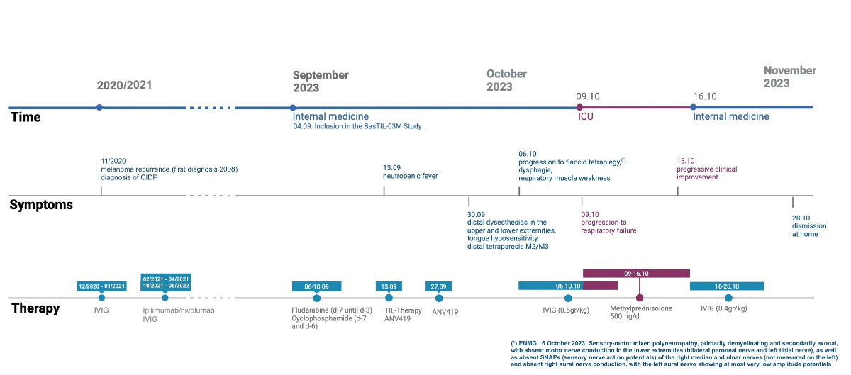 Adoptive cell therapy (ACT) with tumour-infiltrating lymphocytes (TIL) is a personalised immunotherapy based on the infusion of autologous CD4+ and CD8+ T lymphocytes that have been collected from tumour material and expanded ex vivo in the presence of interleukin-2 (IL-2). Preconditioning lymphodepleting chemotherapy is an integral part of current tumour-infiltrating lymphocyte protocols. In vivo tumour-infiltrating lymphocyte activation is generally supported by the administration of high-dose IL-2. TIL-ACT therapy was developed and pioneered by Steven A. Rosenberg and colleagues at the National Cancer Institute (Maryland, US) several years ago (1986) [1, 2]. Objective response rates up to 72% were achieved with TIL-ACT in several consecutive clinical trials, including 10–20% complete remissions and 40% durable clinical responses [3]. Recently, a large phase III clinical trial has demonstrated superiority of TIL-ACT in terms of progression-free survival and overall response rate compared to the immune checkpoint inhibitor (ICI) ipilimumab in pretreated melanoma patients [4]. Although TIL-ACT is an effective treatment, there is still a substantial need to enhance the anti-tumour potential. Furthermore, lymphodepletion and IL-2 treatment are associated with significant toxicities, restricting TIL-ACT to medically fit patients only. New treatment combinations aim at increasing the efficacy of TIL-ACT, while reducing toxicity. We therefore designed a phase I clinical trial (BaseTIL-03M, NCT05869539) that investigates in vivo tumour-infiltrating lymphocyte activation with the novel IL-2Rβγ binding agonist ANV419 in patients with advanced melanoma. ANV419 is an antibody-cytokine fusion protein consisting of IL-2 fused to an anti-IL-2 monoclonal antibody that sterically hinders binding of IL-2 to IL-2Rα, retaining affinity for the receptor β- and γ-subunits and thus limiting signalling through the α subunit on regulatory T cells. The safety of ANV419 has previously been evaluated in a multicentre phase I clinical trial in patients with advanced solid tumours [5]. The study intervention consists of multiple steps, starting with a surgical intervention to collect tumour material for tumour-infiltrating lymphocyte expansion. Tumour-infiltrating lymphocyte expansion is performed at University Hospital Basel’s Good Manufacturing Practice (GMP) Facility for Advanced Therapies (duration: approximately 26 days). Patients undergo preparative lymphodepleting chemotherapy with cyclophosphamide (dose: 60 mg/kg i.v., 1× daily, for two consecutive days) and fludarabine (dose: 25 mg/m2 body surface area i.v., max. dose of 50 mg, 1× daily, for five consecutive days) before receiving the expanded tumour-infiltrating lymphocytes (variable cell number between 5 × 109 and 2 × 1011 tumour-infiltrating lymphocytes) in a single infusion. For in vivo tumour-infiltrating lymphocyte stimulation, patients receive two doses of ANV419 (dose: 243 µg/kg i.v.): the first dose directly after and the second dose two weeks after tumour-infiltrating lymphocyte transfer. Here we report the case of an adult patient with chronic inflammatory demyelinating polyneuropathy who developed a severe exacerbation of chronic inflammatory demyelinating polyneuropathy following TIL-ACT with ANV419.