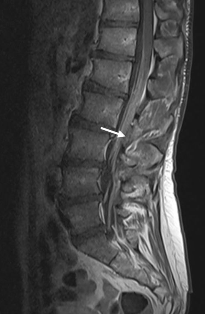 Figure 2Spine MRI (T1 TSE with gadolinium): smooth, non-nodular and diffuse pathological contrast enhancement of the intraspinal nerves and the entire cauda equina primarily compatible with the diagnosis of chronic inflammatory demyelinating polyneuropathy (CIDP).