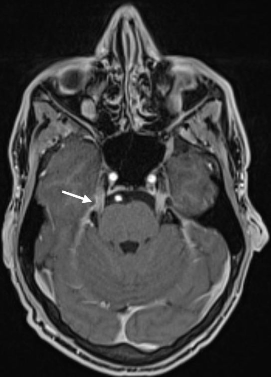 Figure 3Brain MRI (T1 VIBE with gadolinium): symmetrical pathological contrast enhancement of several cranial nerves on both sides (N. trigeminus in the picture, N. oculomotorius, N. facialis) primarily compatible with the diagnosis of chronic inflammatory demyelinating polyneuropathy (CIDP).