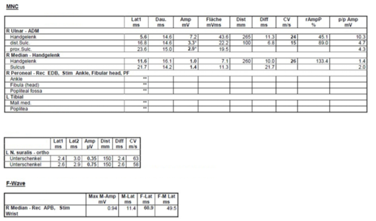 To the best of our knowledge, there are only a few patient cases that describe acute inflammatory demyelinating polyneuropathy / Guillain-Barré syndrome after adoptive cell therapy. Orcurto et al. presented the case of a patient with melanoma who developed Guillain-Barré syndrome after TIL-ACT [10]. The patient was treated with intravenous immunoglobulin resulting in progressive and full recovery. A cytomegalovirus reactivation was detected in this patient and deemed to be the cause of Guillain-Barré syndrome. In 2019, two cases of Guillain-Barré syndrome were reported following adoptive transfer of autologous T lymphocytes transduced with a high-affinity NY-ESO-1-reactive T cell receptor [11]. Both patients received intravenous immunoglobulin with prompt response to the treatment. The authors attributed the onset of acute inflammatory demyelinating polyneuropathy to NY-ESO-1-targeting T cell therapy. In the cases described, there was a rapid and sustained response to intravenous immunoglobulin, whereas in our case there was an unexpected response to steroid treatment, suggesting a different pathophysiology. An antibody-mediated event as a possible cause of the described acute polyneuropathy is possible, but we were not able to identify any antibodies in our assessments. Importantly, we did not test for all possible autoantibodies, e.g. paranodal autoantibodies. A respiratory infection during the immunosuppressive phase of the tumour-infiltrating lymphocyte therapy may have triggered the development of acute inflammatory demyelinating polyneuropathy / Guillain-Barré syndrome as a respiratory infection/pneumonia was diagnosed following the lymphodepleting chemotherapy, although no pathogen was identified. An antecedent gastrointestinal or other infection was not present or could not be determined as the cause. No prior vaccination occurred. No other triggering events were identified; in particular, there was no disease progression in the imaging assessments, although disease progression eventually occurred in the weeks following TIL-ACT. Other causes of acute polyneuropathy must be considered. The electroneurography examination performed in 2022 before study enrolment showed slowed NCV in the peroneal, tibial, median and ulnar nerves with delayed F-wave latencies. Already at that point, the amplitudes of the peroneal and tibial nerves were decreased, which was considered to be consistent with primary demyelination and secondary axonal damage. The electroneurography in the acute setting showed markedly reduced NCV in the right median and ulnar nerves and delayed F-wave latency for the median nerve, whereas no CMAPs were measurable for the right peroneal and left tibial nerve (figure 4). In conjunction with the rapid clinical deterioration, the cerebrospinal fluid findings and the positive response to corticosteroids, the most likely interpretation in our opinion is an inflammatory demyelinating process with secondary axonal damage, rather than axonal damage on top of the pre-existing demyelinating polyneuropathy, although we cannot confirm this based on the available findings.
