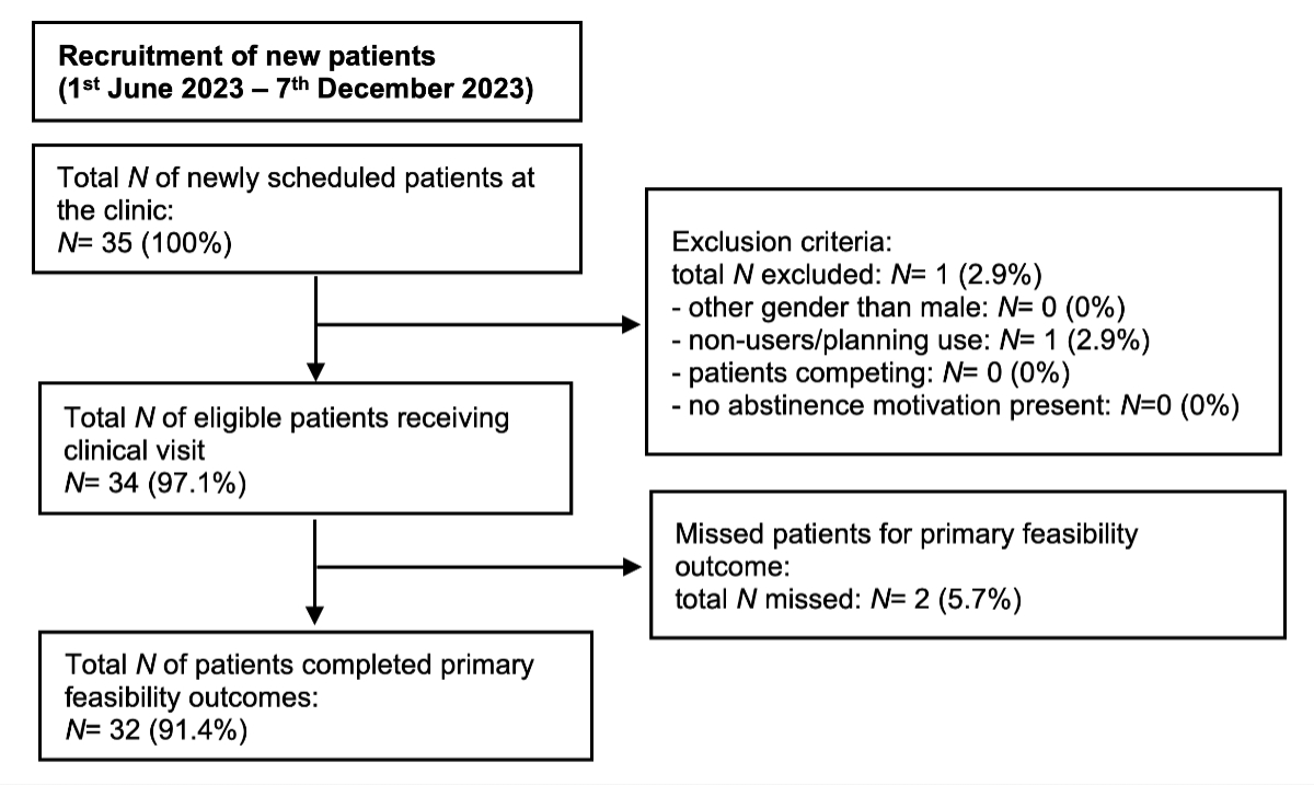The flow diagram of patients included in this study is shown in figure 1. During the recruitment period, we included 34 patients seen at the practice. One patient did not fulfil eligibility criteria as he was a non-user planning to use these substances, thus was outside the legal scope and was not received. Two patients failed to complete the feasibility questionnaire (primary feasibility outcome).