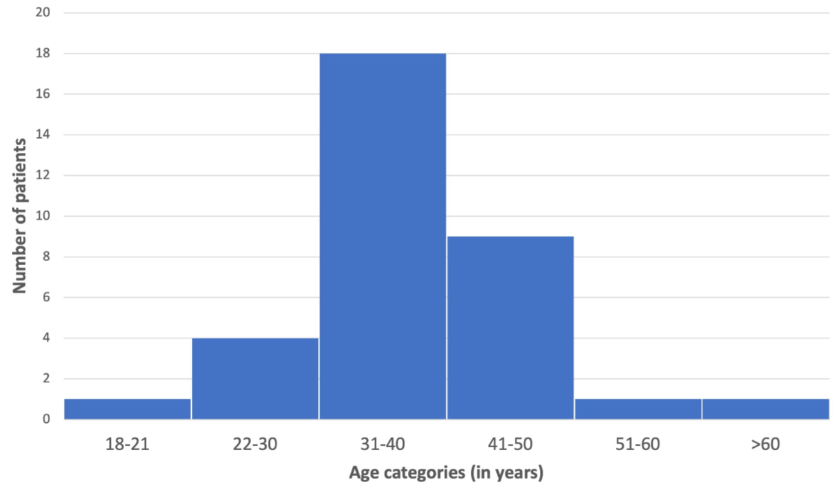 All sociodemographic data of male participating patients are summarised in table S2 in the appendix. Most patients were self-referrals (82%) seeking medical laboratory screening while using anabolic agents (91%), but also seeking support with anabolic steroid cessation (47%) or advice and information about the problematic use of these substances (21%). The mean age of patients was 38.5 years (standard deviation [SD]: 8) with a range from 21 to 61 years of age displayed in figure 2. Patients were mostly homosexual (68%) or heterosexual (29%) males; either in a relationship (56%) or single (35%); were currently working (88%); had an educational level beyond compulsory schooling (94%); many had an academic career (41%). Patients were most frequently working out over 3 days per week and had multiple years of experience at the gym. Patients had diverse professional backgrounds (qualitative data), including directors/CEOs, managers, IT specialists, engineers, insurance specialists, as well as a consultant, lawyer, police officer, school principal, hairdresser, photographer, banker, medical aesthetician, sex worker, with some being unemployed and on social welfare.