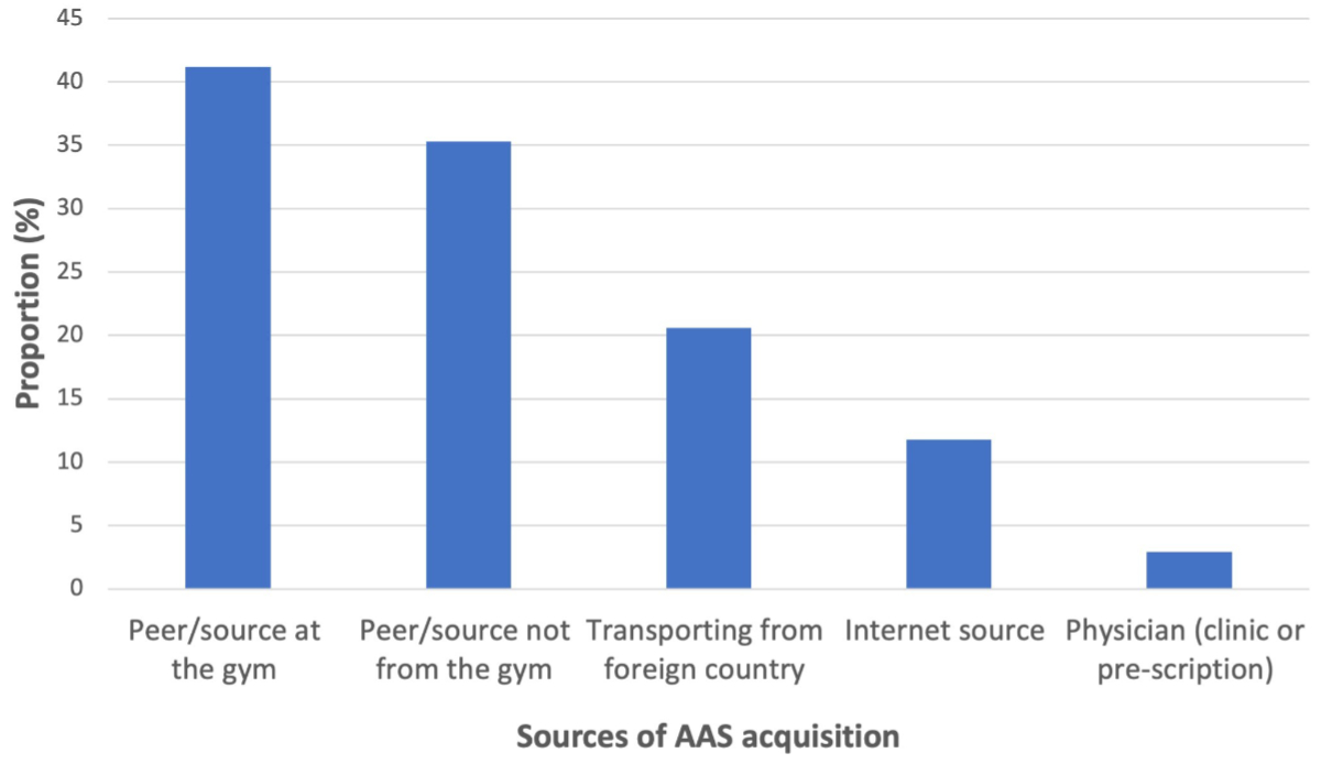 Figure 3Sources of anabolic androgenic steroid (ASS) acquisition among patients using anabolic androgenic steroids (proportion in %) presenting at the primary care practice during the first clinical assessment in Zurich, grouped by sources.