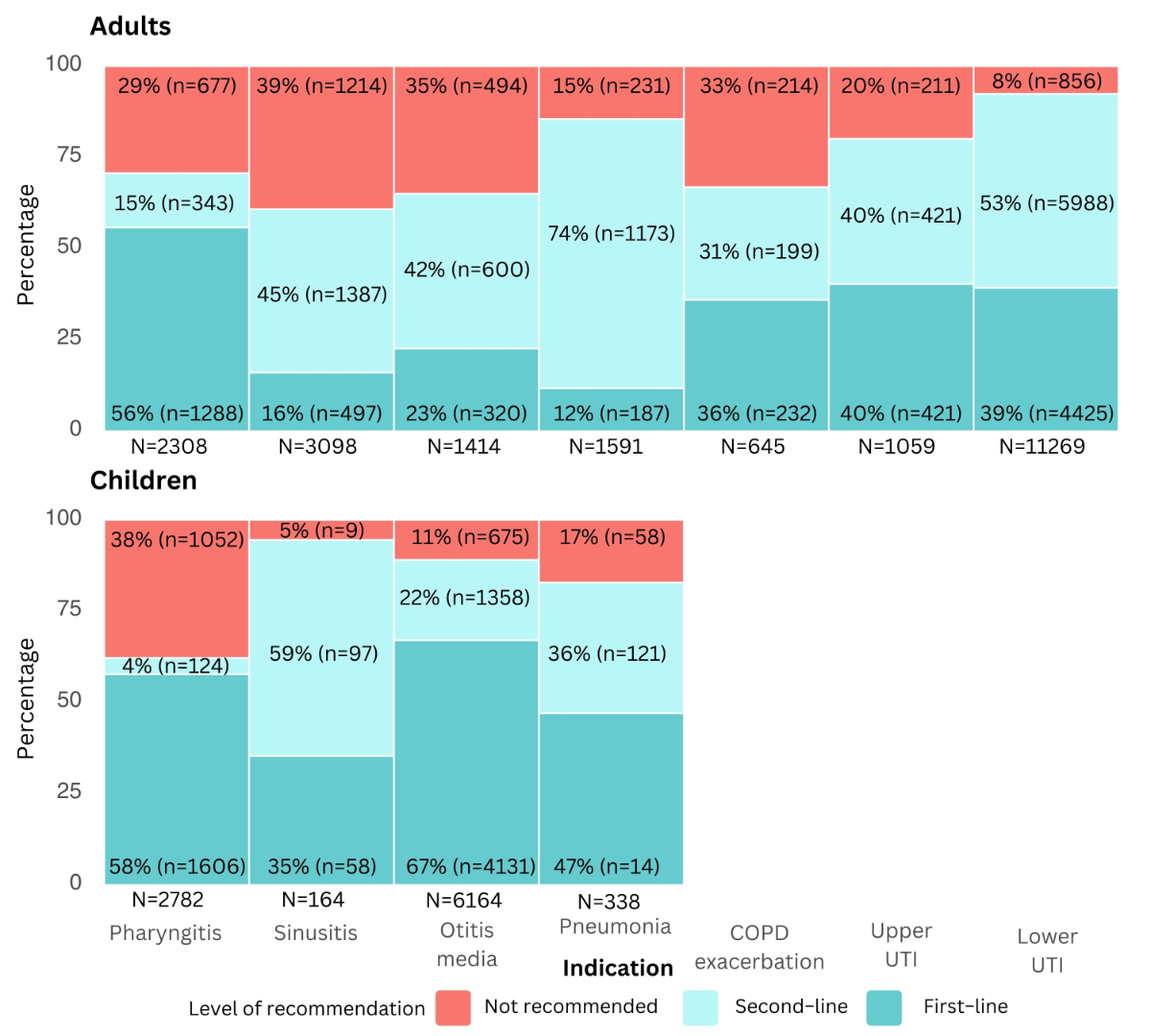Our study also found that the proportions of not-recommended antibiotics were lower in children than in adults across all indications. This aligns with other research indicating that the proportion of inappropriate prescribing in children ranges from 16% to 29%, which is lower than in adults [26–28]. For pharyngitis, the second most common indication in children, 38% of antibiotic prescriptions were not-recommended, with penicillin being the most frequently prescribed among them. After consulting the guideline authors, we learned that while penicillin was omitted due to its more complex regimen compared to amoxicillin, it can still be used to treat pharyngitis. Thus, the proportion of not-recommended antibiotics for this indication is indeed high, but not strictly speaking inappropriate.