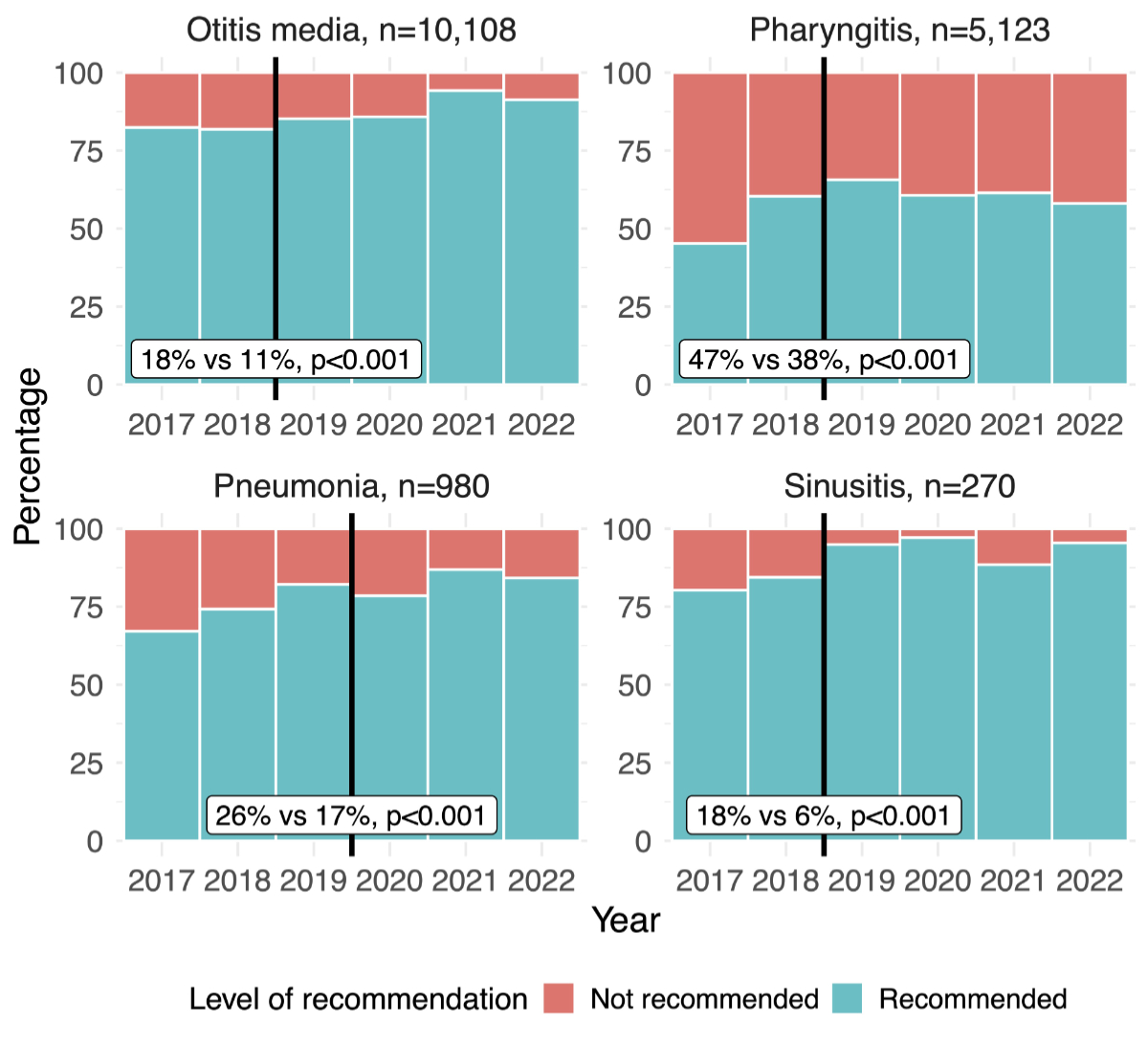 Figure 6Change in proportion of recommended and not-recommended antibiotic prescriptions before and after the introduction of the guidelines over years in children by indication. Black vertical lines show the year of introduction of guideline. The percentages in the white boxes denote the proportion of not-recommended antibiotics prescribed before (left) and after (right) the guideline implementation, p-values reflect the significance of changes in adherence over time, calculated for each clinical indication using a Chi-squared test. Entries with missing data (n = 50), specifically related to patient sex, age, clinical indications and antibiotic categories, were excluded from all analyses at the first step of the flowchart, without selective exclusion from specific figures.