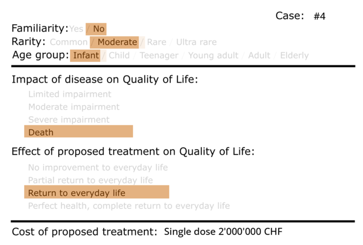 This study was conducted within the framework of the University Research Priority programme “Innovative Therapies in Rare Diseases of the University of Zurich” (ITINERARE). Recognising the limitations of traditional survey-based research due to framing effects [21], the study drew inspiration from Bourke et al.’s approach [17]. Our exploratory study employed visual discrete-choice surveys. By presenting scenario cards depicting various medical situations, participants were prompted to evaluate their willingness to allocate financial resources to treat patients in varying contexts.