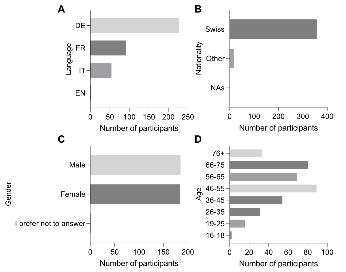 The survey was distributed to a representative sample of Swiss residents with the assistance of the polling company Demoscope. We collected 417 responses. After filtering out responses from individuals who did not consent to the use of their data and those who completed the survey in under three minutes, we obtained 375 responses. Most respondents were German-speaking, followed by French and Italian speakers, with a small number of English speakers (figure 2A). The majority of respondents were Swiss nationals (figure 2B), the sex ratio was balanced (figure 2C) and the age distribution reflected the Swiss demographic profile (figure 2D).