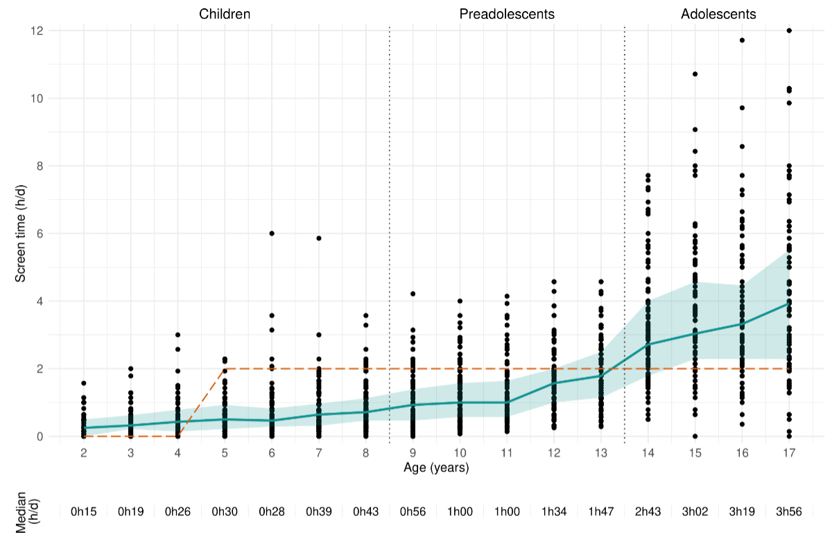 Our findings raise concerns for the current and future health of young individuals since carrying excess weight during childhood tends to persist into adulthood [51] and because adolescent psychological symptoms predict later episodes of mental disorder [52]. Strengthening parents’ knowledge of screen guidelines and of the adverse effects of unhealthy use has been proposed as an effective way of limiting young people’s screen time [53]. However, beyond awareness, parental barriers to successfully implement screen rules should also be considered [45]. For instance, parents frequently mentioned time constraints as a reason for resorting to screen use to occupy their young children while they attended to daily chores [54]. Parents of adolescents also expressed doubts about the practicality of adhering to recommendations they perceived as overly restrictive. Some admitted to abandoning screen time rules due to failure or conflicts [55]. Therefore, in line with the updated screen guidelines of the American Academy of Pediatrics [56], carefully reviewing content quality for children and promoting a moderate and safe screen use for adolescents might be a more pragmatic and acceptable approach for families than strictly limiting screen time. Structural measures proposing financially accessible and convenient alternatives to screen use, such as childcare or extracurricular activities, could also be effective while providing support to parents [45].