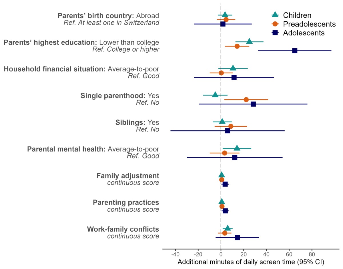 Family characteristics such as average-to-poor parental mental health (+14 minutes/day; 95% CI: 2–27) or higher work-family conflicts (+6 minutes/day; 95% CI: 2–10) were also determinants of higher screen time among children (figure 2, table S3 in the appendix). Furthermore, participants – whether children, preadolescents or adolescents – whose parents had less favourable parenting practices tended to spend more time on-screen. Having siblings was not associated with screen time.