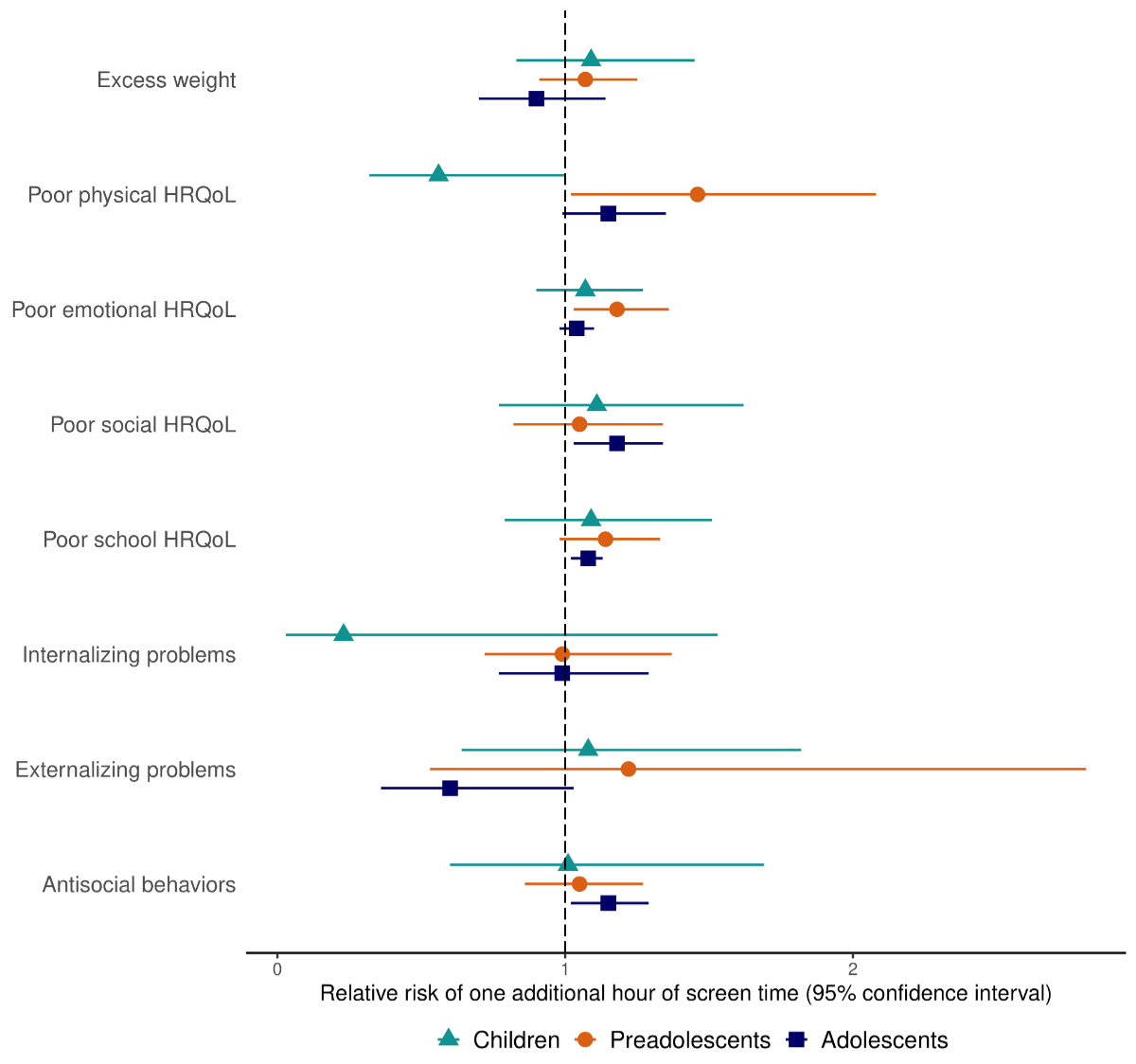 Figure 3Effects of screen time on physical and psychosocial health after one year among children (2–8 years old, n = 674), preadolescents (9–13 years old, n = 752) and adolescents (14–17 years old, n = 434). Results are from generalised linear models following a quasi-Poisson distribution adjusted for age, sex, sociodemographic characteristics, physical activity, extracurricular activities and the baseline level of each health outcome among all participants, and for the number of close friends among preadolescents and adolescents. HRQoL: health-related quality of life.