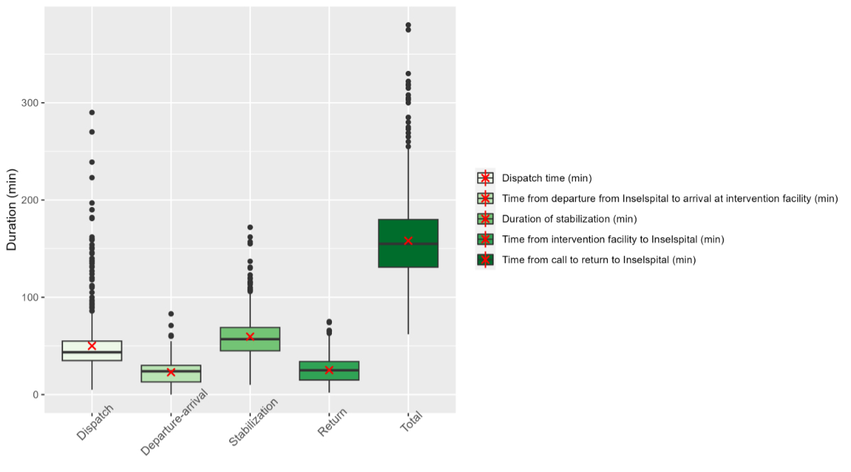 Patient and transport characteristics, and outcomes are delineated in tables stratified by the primary outcome (death or impairment), without any formal statistical testing. Categorical variables are summarised as counts and proportions, while continuous variables are described using medians with interquartile ranges (IQR) or means with standard deviations (SD), as appropriate. Transport times, including dispatch time, departure-arrival time, stabilisation time, return time and total transport time are depicted in boxplots.