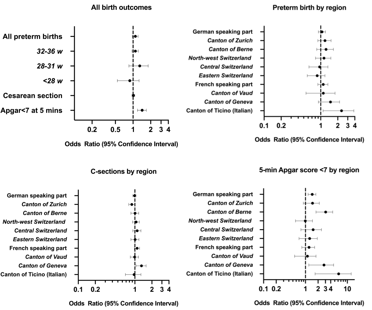 This nationwide observational study included over 85% of all singleton births in Switzerland between 2018 and 2020. We did not observe a sizeable country-wide change in the incidence of adverse birth outcomes during the COVID-19-related lockdown between 16 March and 10 May 2020. However, in the canton of Ticino, we observed a 2-fold increase in the risk of preterm birth (<37 weeks) and a 4.6-fold increase in the proportion of newborns with an Apgar score <7 at 5 minutes during the lockdown period in 2020. The canton of Ticino borders northern Italy and had the highest number of COVID-19 infections during this time, but the increased risks are based on a small sample size [25]. Preterm births were not increased in other regions of Switzerland, whereas Apgar scores <7 were also more frequent in Bern (2.8-fold) and Geneva (2.4-fold). C-sections were not increased during the lockdown.