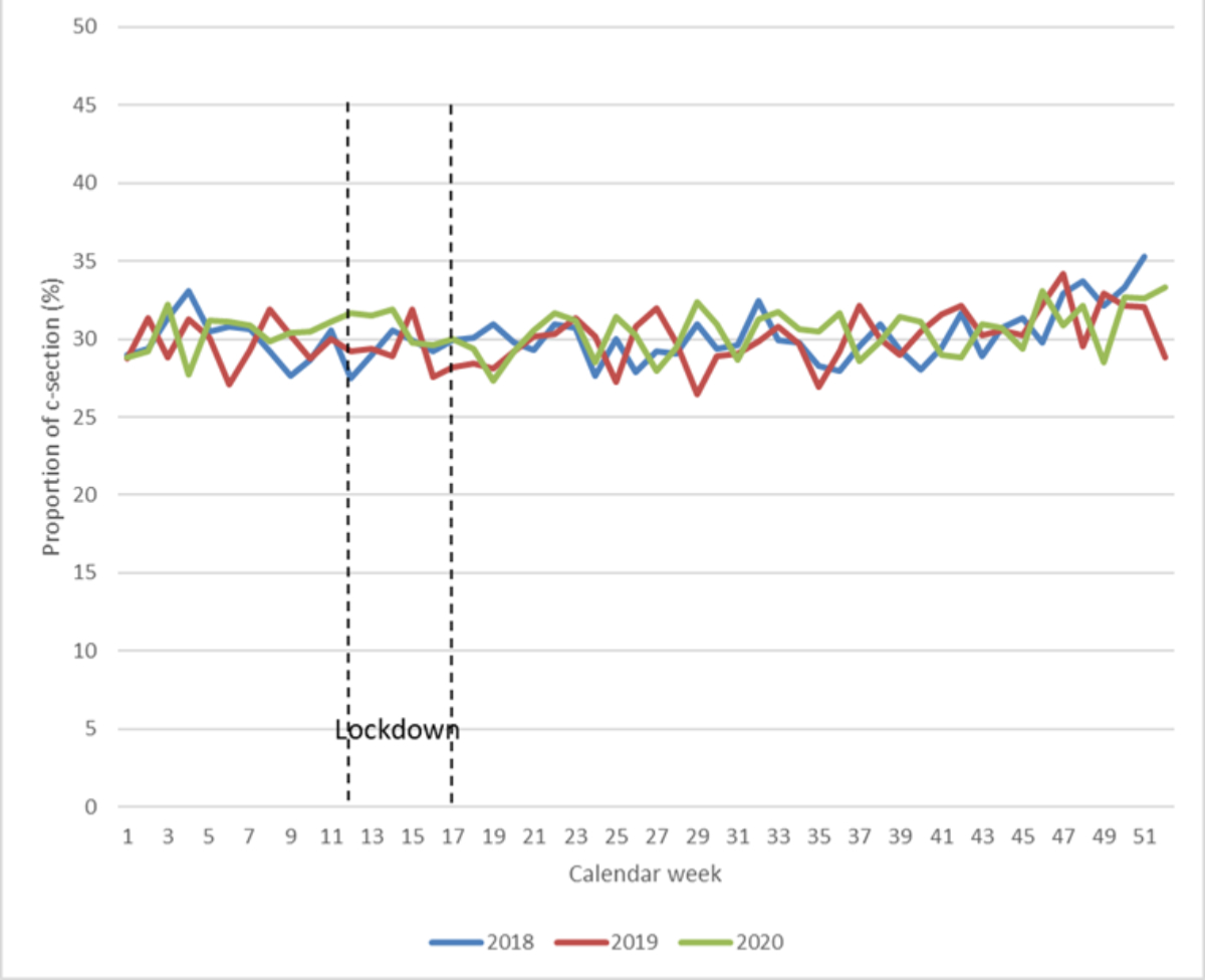 Figure 4Weekly proportion of Caesarean sections (C-sections) between 2018 and 2020 in Switzerland.