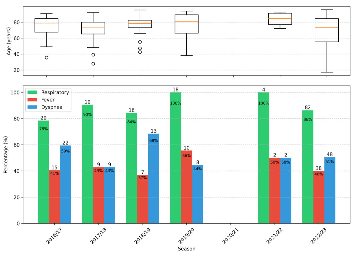 Figure 3Seasonal variation of symptoms and age distribution of 194 patients with positive reverse transcription–polymerase chain reaction (RT-PCR) tests at Spital Emmental 2016–2023. Age boxplots display: median (orange central line); interquartile range (IQR) Q1–Q3 (box); whiskers extending to most extreme points within 1.5 × IQR of Q1 and Q3; and individual points for outliers beyond these bounds.