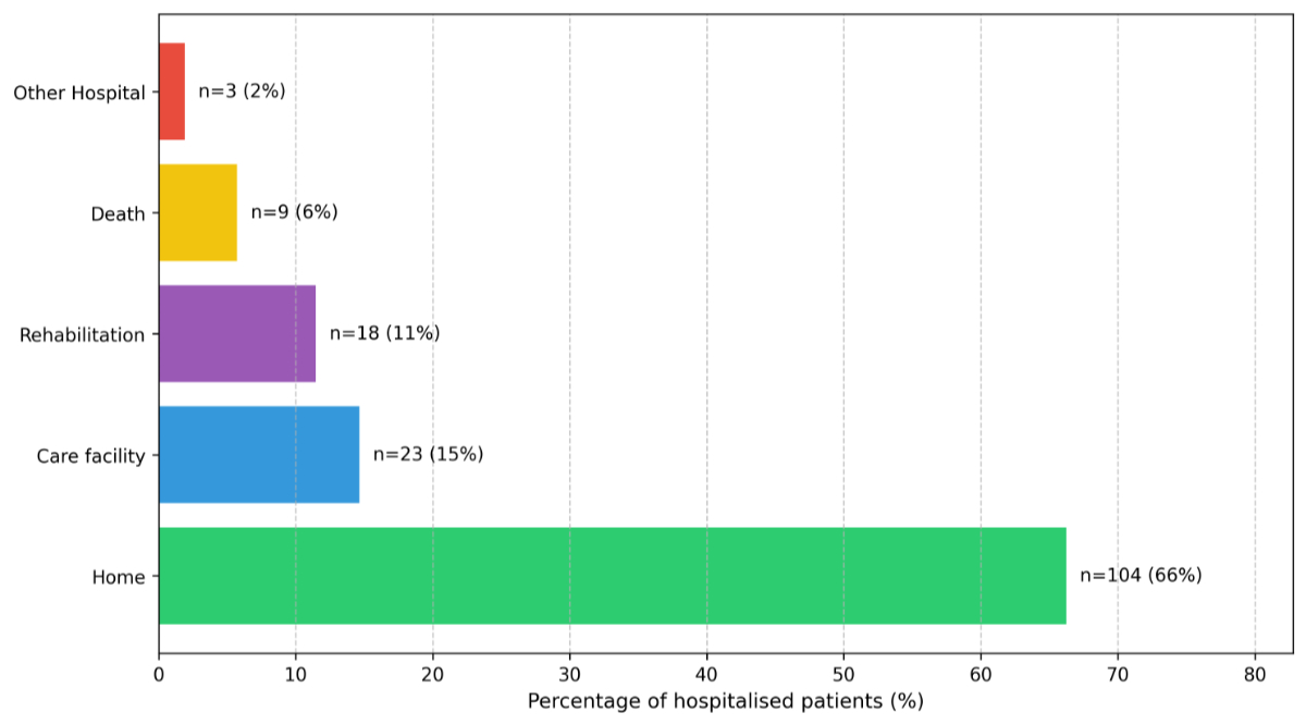 The mean hospital stay was 8 days (range 1–38 days). Of the hospitalised cohort, 66% were discharged home, 15% transferred to nursing homes, 11% to rehabilitation facilities and the outcomes of the remaining 2% are unknown due to hospital transfers at discharge (figure 4). In-hospital mortality was 6%.