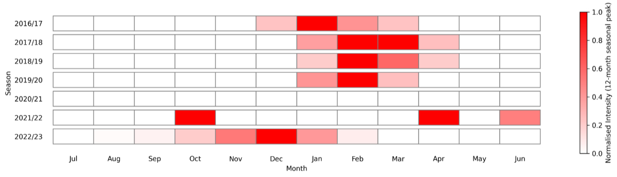 Figure 5Temporal pattern of maximal seasonal intensity* of positive RSV RT-PCR tests at Spital Emmental 2016–2023. * Normalised intensity calculated as monthly number of positive tests relative to the 12 month (July–June) seasonal monthly peak value. RSV: respiratory syncytial virus; RT-PCR: reverse transcription–polymerase chain reaction.