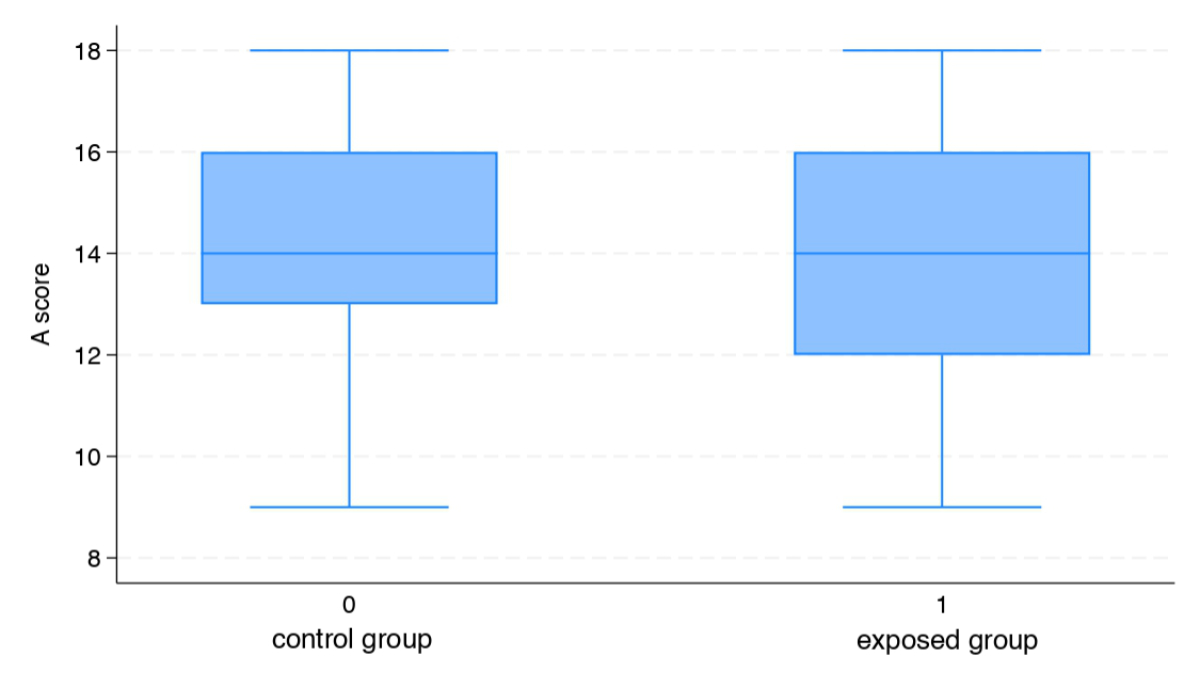 The average A score was 14.2 points (SD: ±2.6) and 14.0 points (SD: ±2.3) out of 18, in the exposed and control group, respectively, and no significant difference was reported when comparing the two groups (p = 0.77) (figure 2).