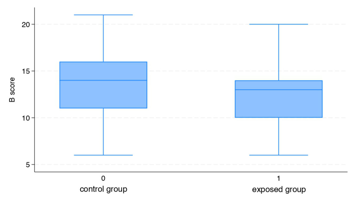 The average B score was 12.6 (SD: ±3.3) and 13.4 (SD: ±3.4) points out of 22 in the exposed and control group, respectively, and no significant difference was reported when comparing the two groups (p = 0.25) (figure 3).