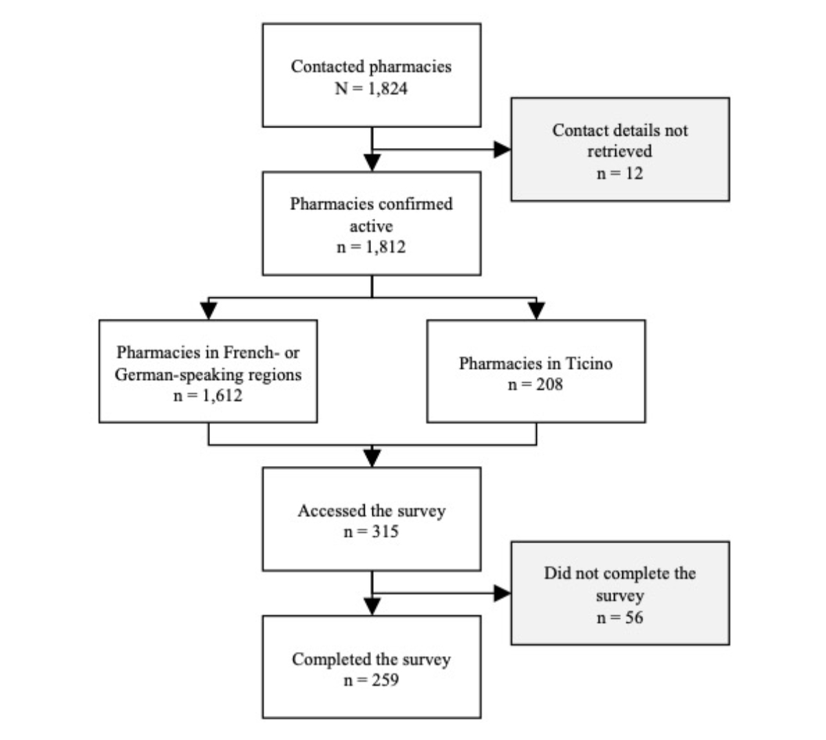 Based on Swiss Federal Statistics [23], there were 1839 community pharmacies in Switzerland in 2022 (appendix figure S1). In April 2022, 1824 pharmacies were invited to participate in the survey (1812 were confirmed active based on a follow-up in 2025). Of these, 208 pharmacies (11.4%) were in the Italian-speaking region of Switzerland (Ticino) and were therefore not expected to complete the survey in another language, reducing the number of eligible pharmacies to 1612. Overall, 250 of 1612 pharmacists (15.5%) completed the survey, along with 9 pharmacists located in Ticino, who were thus included in the statistical analysis. As depicted in figure 1, the total sample size was 259, accounting for 14.1% of the pharmacies in Switzerland in 2022.