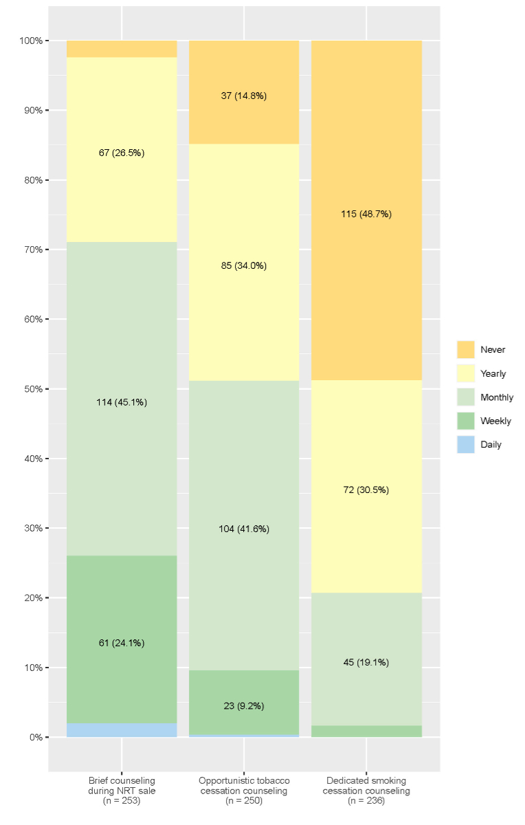 Brief counselling during sales of nicotine replacement therapies was offered at least once a month by 180 (71.1%) pharmacists (figure 3). Brief opportunistic smoking cessation counselling was offered by 128 pharmacists (51.2%) at least once a month. Dedicated smoking cessation counselling was offered by 49 (20.7%) pharmacists; 115 reported never offering dedicated counselling. Regarding the duration of the different interventions, 174 respondents (67.2%) spent 5 to 15 minutes on brief counselling during the sale of nicotine replacement therapies, while 133 (51.4%) spent the same amount of time on brief opportunistic smoking cessation counselling. For dedicated smoking cessation counselling, 57 (22.0%) pharmacists reported spending 16 to 30 minutes on the intervention, and 15 (5.8%) reported spending more than 30 minutes, accounting for 46.2% of the pharmacists offering such counselling.