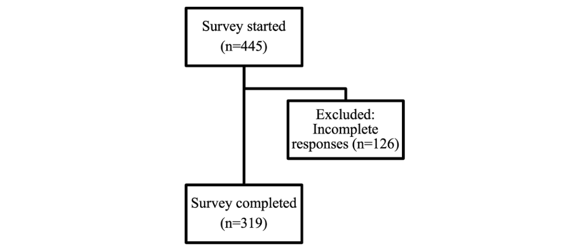 A total of 445 physicians started to answer the questionnaire from which 319 physicians (72%) completed the questionnaire and were available for analysis, including 265 specialists and 54 physicians in training (i.e. resident physicians) (table 1; for details on exclusion, see figure 1).