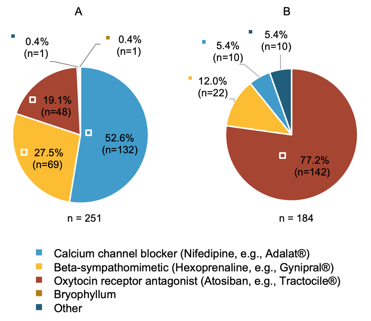Figure 3Medications used as first-choice tocolytic according to pregnancy risk. Only asked to hospital and attending physicians. (A) Which medication do you use as the first-choice tocolytic in case of acute threatened preterm birth in the context of an uncomplicated singleton pregnancy? (n = 251) (B) Which medication do you use as the first-choice tocolytic in case of acute threatened preterm birth in the context of a high-risk pregnancy (multiples, extreme preterm birth, intrauterine growth restriction [IUGR], bleeding due to placenta previa)? (n = 184) Only asked to participants reporting that they differentiate between their choice of tocolytic based on type of pregnancy in previous question (table S4 in appendix 1). “Other”: see table S3 in appendix 1, which is available at https://doi.org/10.57187/s.4453.