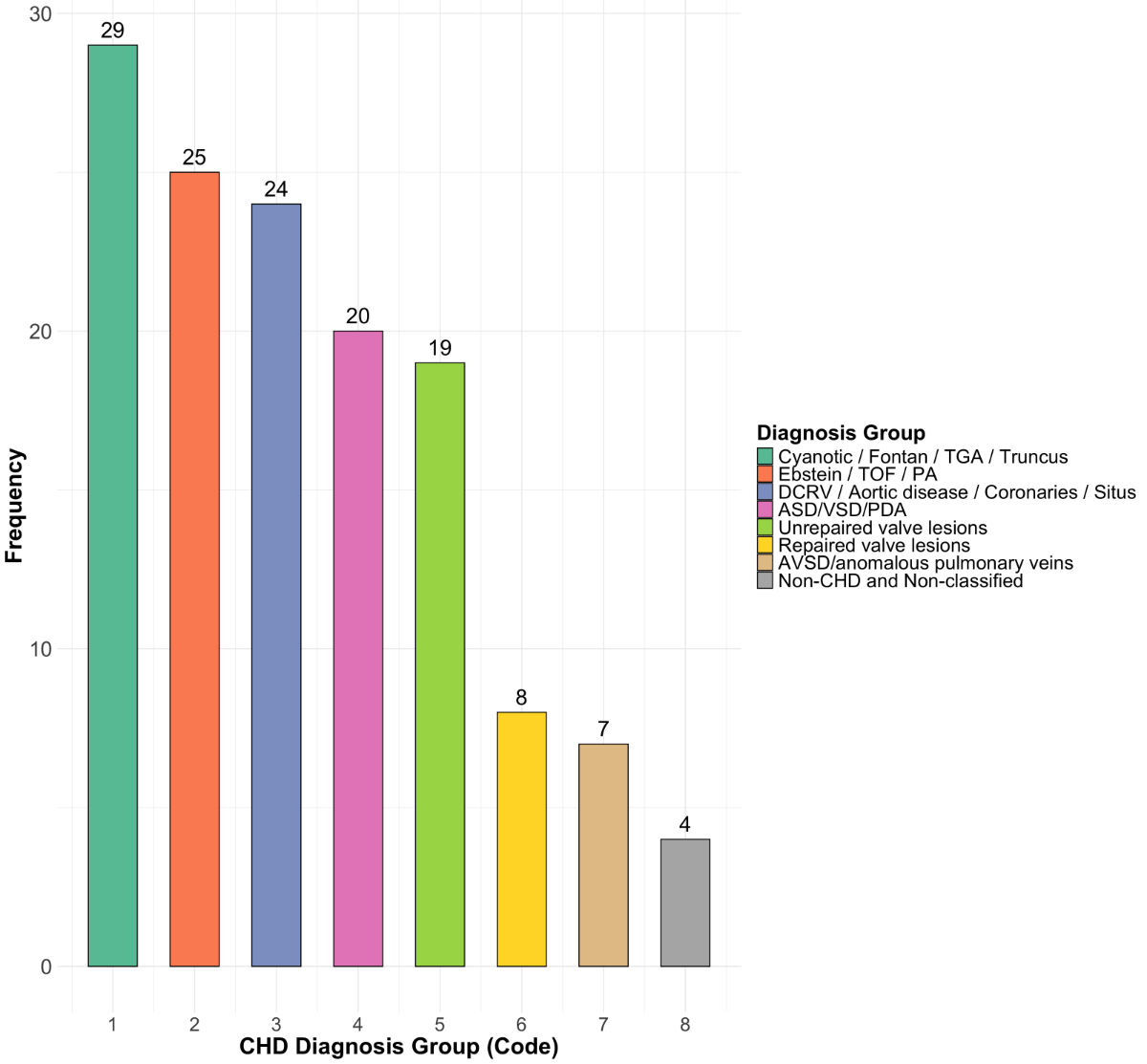 Figure 2Frequency of congenital heart disease diagnoses group (unique patients, n = 136) of admitted adult congenital heart disease (ACHD) patients. ASD: atrial septal defect; AVSD: atrioventricular septal defect; CHD: congenital heart defect; DCRV: double-chambered right ventricle; PA: pulmonary valve atresia; PDA: patent ductus arteriosus; TGA: transposition of the great arteries; TOF: tetralogy of Fallot; VSD: ventricular septal defect.