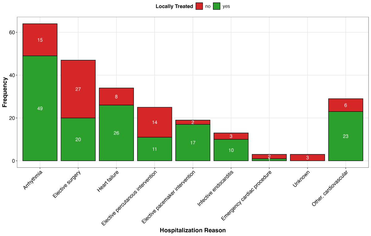 Adverse cardiac outcome and hospitalisation data were collected by local chart review. They included all recorded adverse cardiac events that occurred between the time of inclusion into the study and the last recorded physician or hospital visit within the study period. We included date of hospitalisation, place of management (regional vs supraregional) and reason for hospitalisation (elective vs emergency).