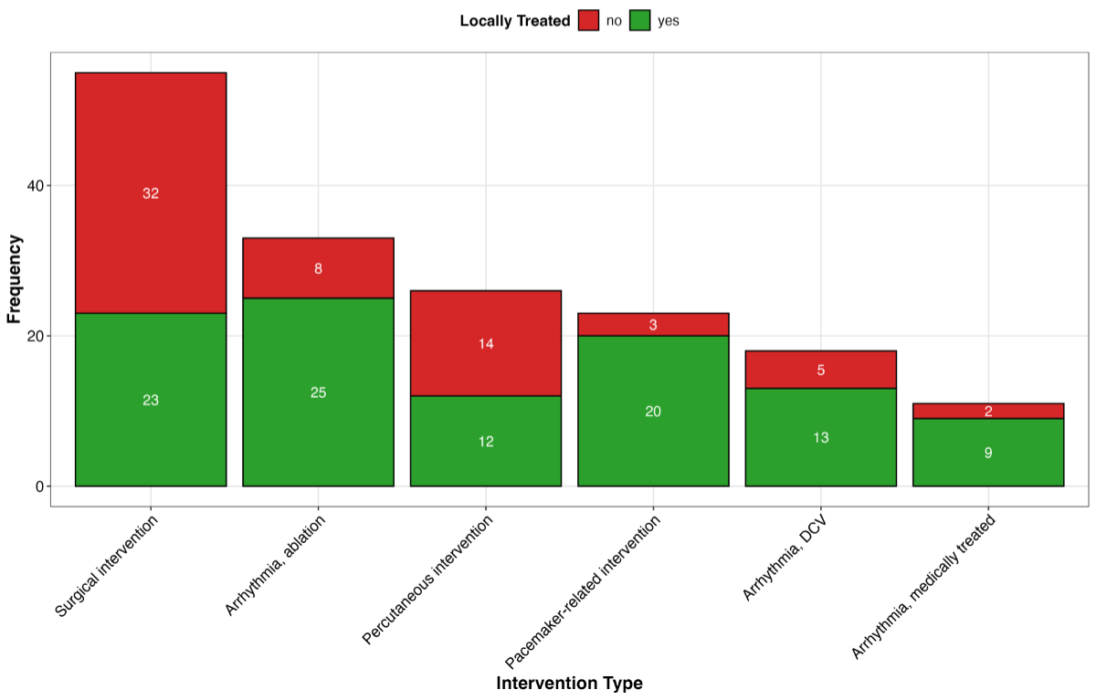 Arrhythmias leading to hospital admission were the most frequent cardiac-related complications. Of the 64 arrhythmia events, recorded in 37 patients, most were atrial flutter and intra-atrial re-entrant tachycardia (n = 26, 41%). Most arrhythmia events (n = 49, 77%) were managed locally at regional ACHD centres. In 31 cases (48%), arrhythmias led to an emergency admission, of which 24 (77%) were managed locally. Overall, 11 (17%) arrhythmia cases were managed with antiarrhythmic drugs, 18 (28%) by electrical cardioversion and 33 (52%) by interventional ablation procedures, of which 25 (76% of ablations) were performed at the regional ACHD centres.