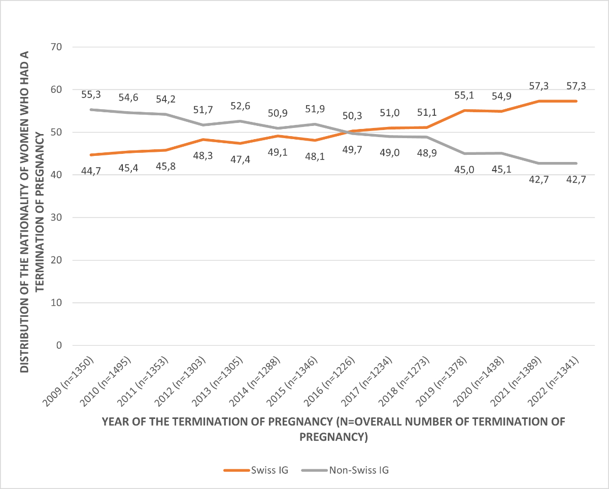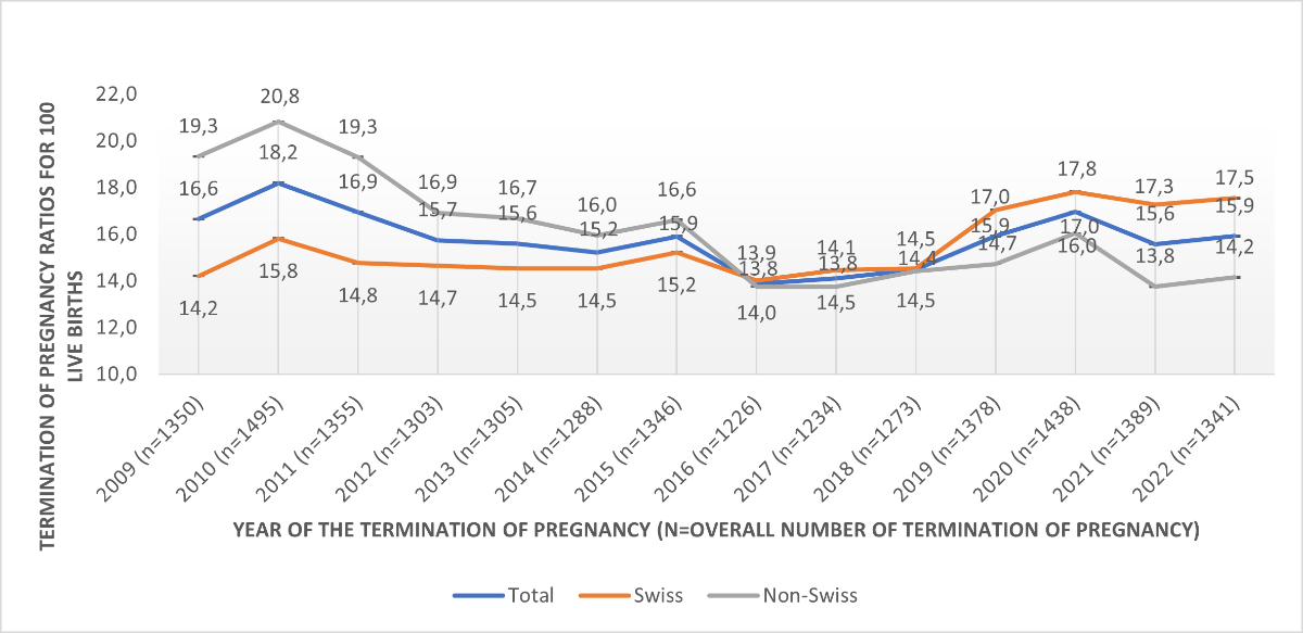 Moreover, a shift has occurred among Swiss and non-Swiss women: in 2016, there were more terminations of pregnancy per 100 live births among Swiss women than non-Swiss women, whereas the opposite was true before 2016. This result may be explained by the fact that among Swiss women, the number of live births remained relatively stable between 2009 and 2022, while the number of terminations of pregnancy increased significantly between 2016 and 2022, leading to an increase in the ratio of terminations of pregnancy per 100 live births. However, among non-Swiss women, the number of births increased between 2009 and 2016, before decreasing, and the number of terminations of pregnancy decreased between 2009 and 2022, which explains why the ratio of terminations of pregnancy per 100 live births decreased from 2009 until 2016, before rising slightly.