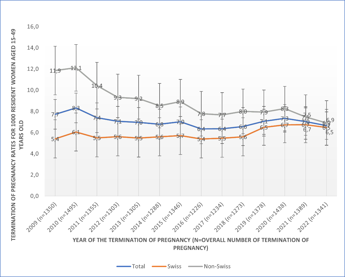Figure 1Termination of pregnancy rates for 1000 resident women aged 15–49 years in the period 2009–2022, comparing non-Swiss and Swiss women. 95% confidence intervals are shown.