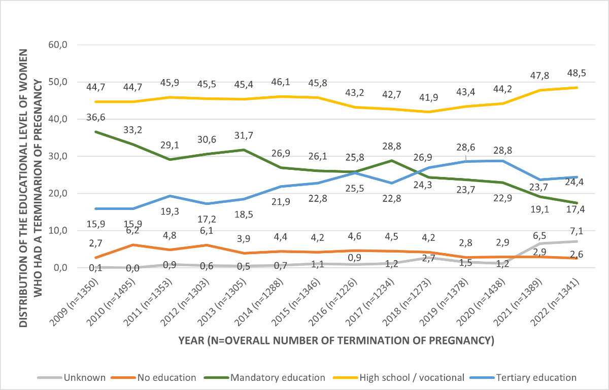 In 2022, among women who underwent a termination of pregnancy, almost half (48.5%) had a degree from a high school/vocational education, a quarter (24.4%) had a tertiary education and one seventh (17.4%) had completed compulsory education (table 1). Between 2009 and 2022, the relative proportion fell for women who completed compulsory education (36.6% to 17.4%) and rose for women who completed tertiary education (15.9% to 24.4%). The proportion of women with no education who went through a termination of pregnancy has remained stable since 2009 (2.7% in 2009 and 2.6% in 2022) (figure 5).