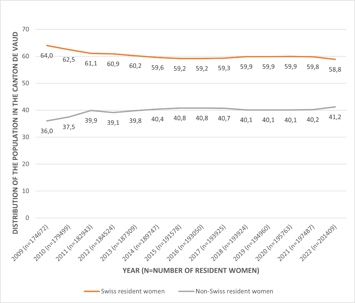 Between 2009 and 2022, the proportion of single women increased (from 59.5% in 2009 to 65.3% in 2022) while that of married women decreased (from 27.0% in 2009 to23.6% in 2022), reflecting a general trend in the canton of Vaud, where the rate of marriages per 1000 inhabitants has decreased since 2009 (5.3 in 2009 vs 4.2 in 2022) [21].