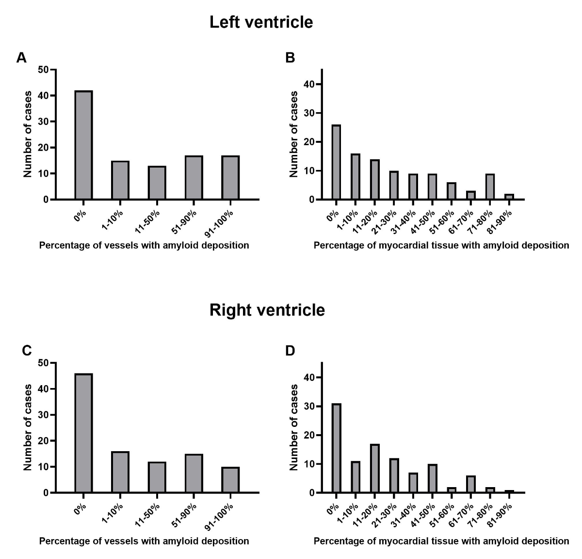 Figure 2Distribution of cases depending on the location and extent of amyloid depositions. (A and C): Percentage of myocardial vessels with amyloid deposition categorised by vascular score in the left (A) and right (C) ventricle. (B and D): Percentage of interstitial amyloid deposition in relation to the myocardial tissue surface categorised by myocardial interstitial score in the left (B) and right (D) ventricle.