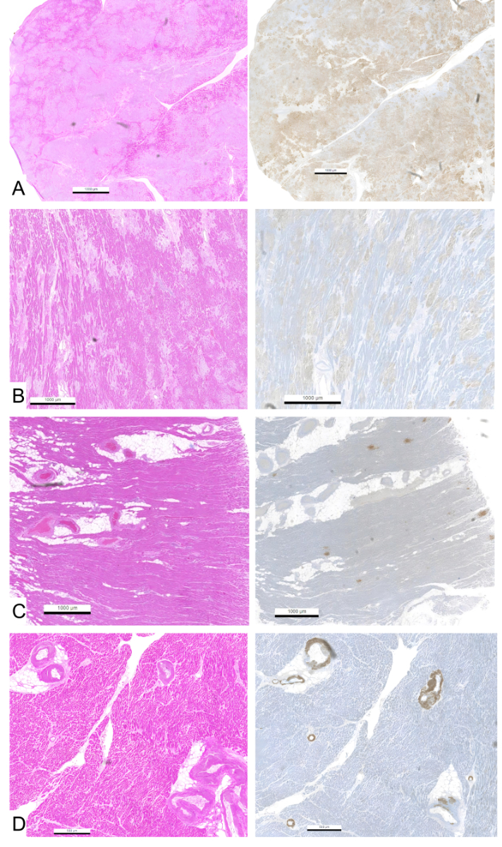 Figure 3Haematoxylin & Eosin slides showing different percentages of interstitial (A–C) and vascular (D) amyloid deposits with respective score and corresponding ATTR immunohistochemistry. (A): Extensive interstitial amyloid deposits in >90% of the myocardial surface, resulting in a myocardial score of 9. (B): Interstitial amyloid deposits in 50–60% of the myocardial surface, resulting in a myocardial score of 5. (C): Interstitial amyloid deposits in under 10% of the myocardial surface, resulting in a myocardial score of 1. (D): Amyloid deposits shown in >90% of myocardial vessels, resulting in a vessel score of 4.