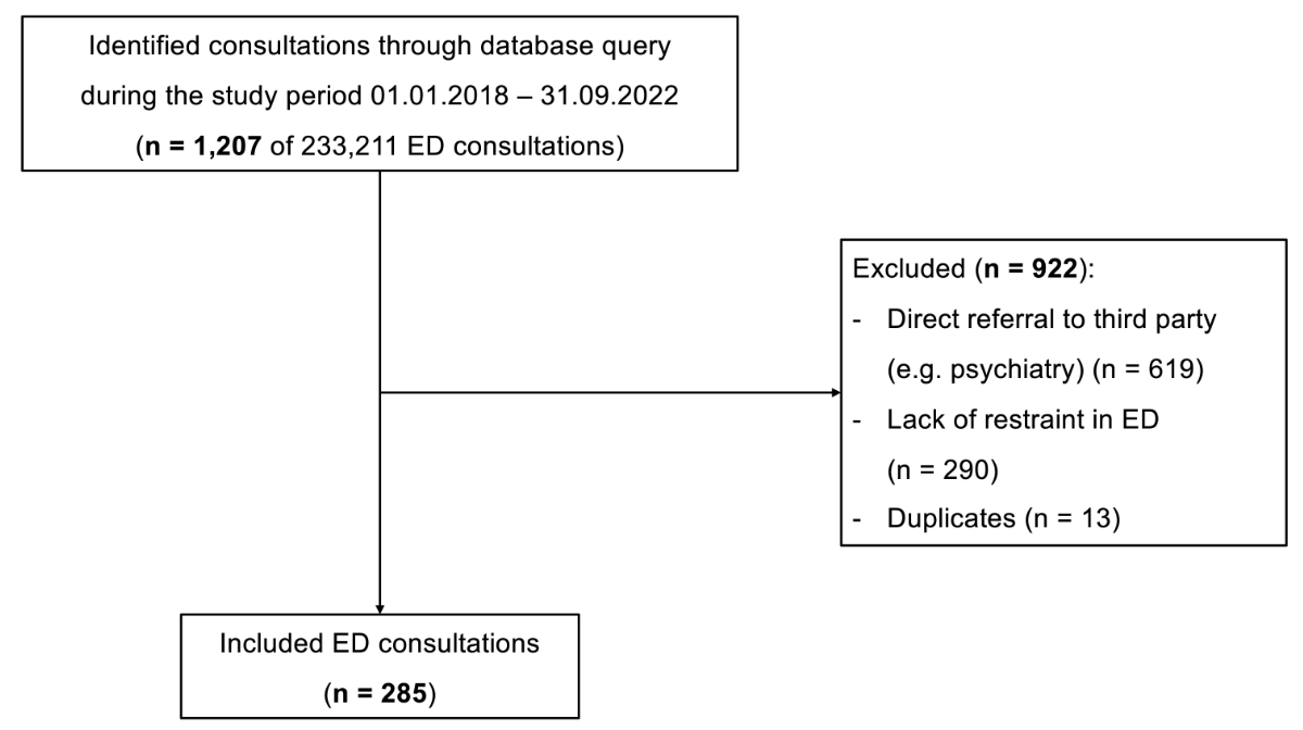 The medical records of all ED consultations during the study period are stored in digital full text in the clinical database system, E-Care ED v2.1.3.0 (Mesalvo Turnhout BV, Turnhout, Belgium). This medical database enables access to previous diagnostic reports, consultations and other pertinent medical documents. Cases were identified through a comprehensive full-text search algorithm using specific search terms “fixation” (which is the commonly used term in German for restraint), “fix*” and “aggression”. The medical records obtained were extracted and assessed for eligibility, through manual full-text analysis by NH. All patients aged 16 years or older who presented to our ED during the specified period were included if they were initially assessed by an emergency physician (with psychiatric consultation upon request) and underwent mechanical restraint using a 5-point fixation bed for any reason (e.g. aggressive/agitated behaviour) during their ED stay. Patients were excluded if they did not undergo mechanical restraint or were directly assigned to the psychiatric emergency service. Direct referral to the psychiatric emergency service at our institution is determined by a triage nurse and is reserved for patients who do not require urgent pharmacological intervention (e.g. for seclusion), physical examination, laboratory testing, imaging studies and/or mechanical restraint.