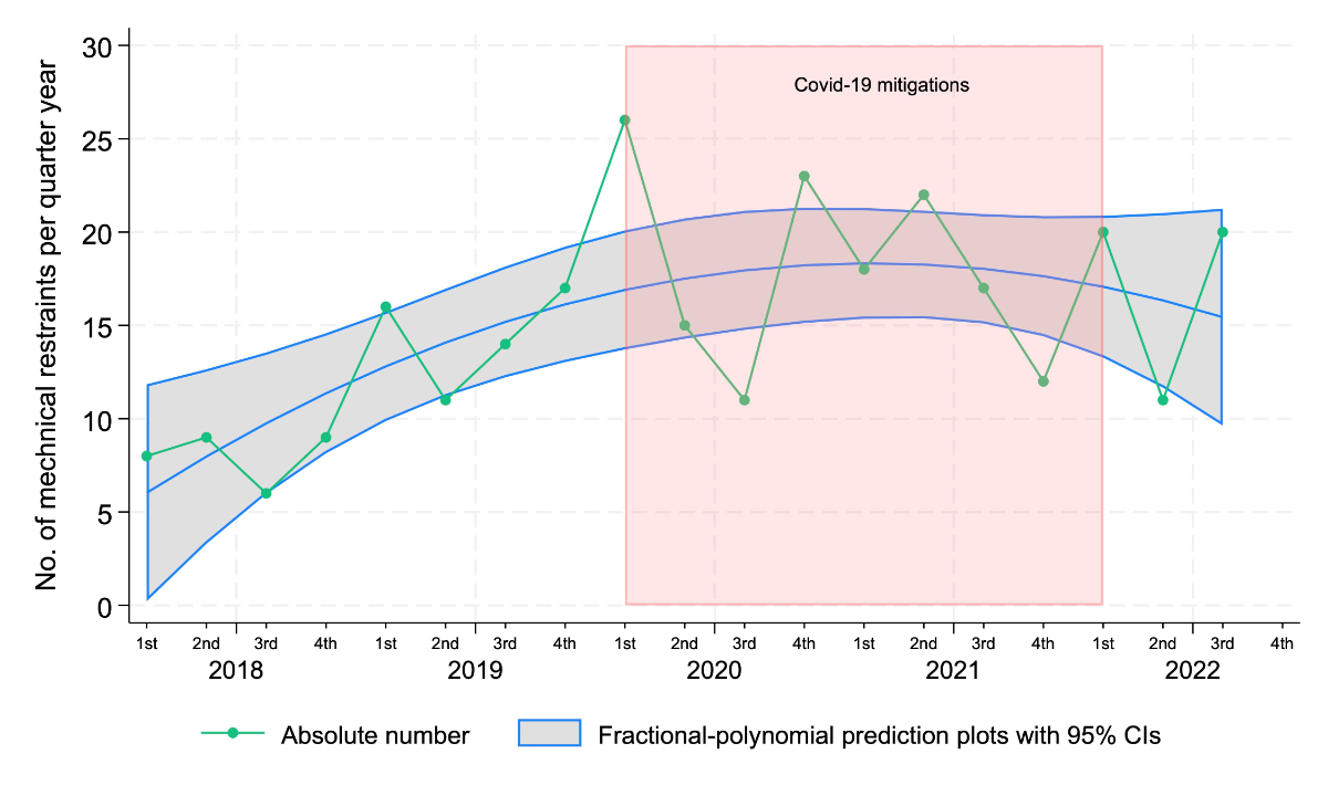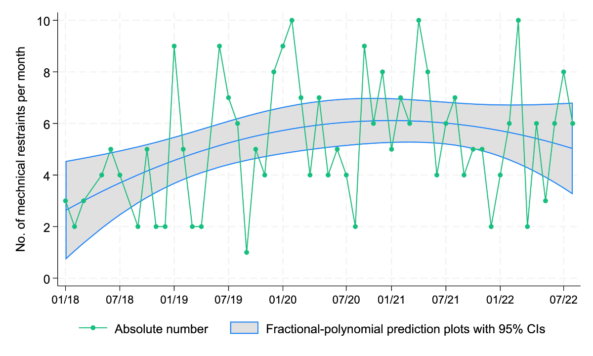 The fractional-polynomial prediction plot with 95% CI showed a similar trend, with an increase in mechanical restraints up until 2020, followed by a stabilisation or slight decrease in the subsequent years.