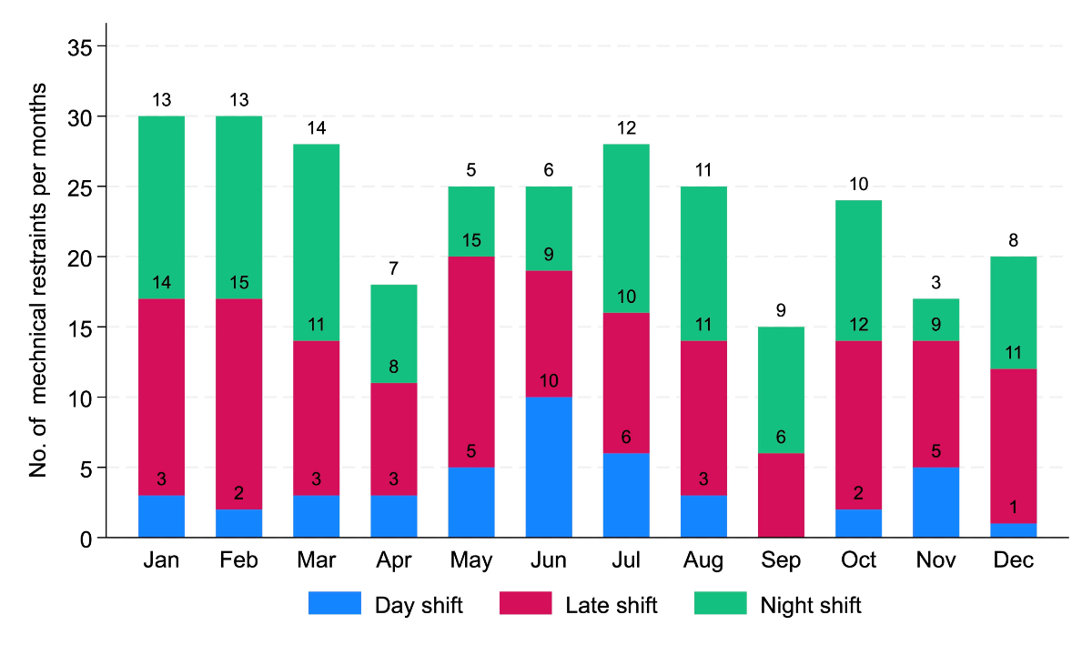 The number of mechanical restraints followed a circadian pattern: 15.1% of the restraints took place during the day shift (07:30–14:00), 46% during the late shift (14:00–22:30) and 38.9% during the night shift (22:30–07:30 (figure 3).