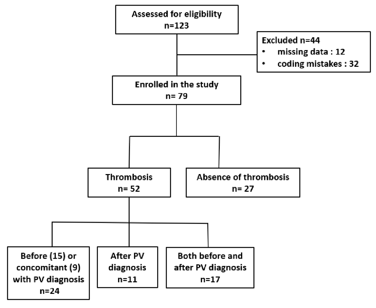 In total, 123 patients were identified using the search strategy (figure 1). Forty-four (35%) were excluded because of erroneous coding or missing data. Ultimately, we included 79 patients, 27 (34%) without thrombosis and 52 (66%) with thrombosis.