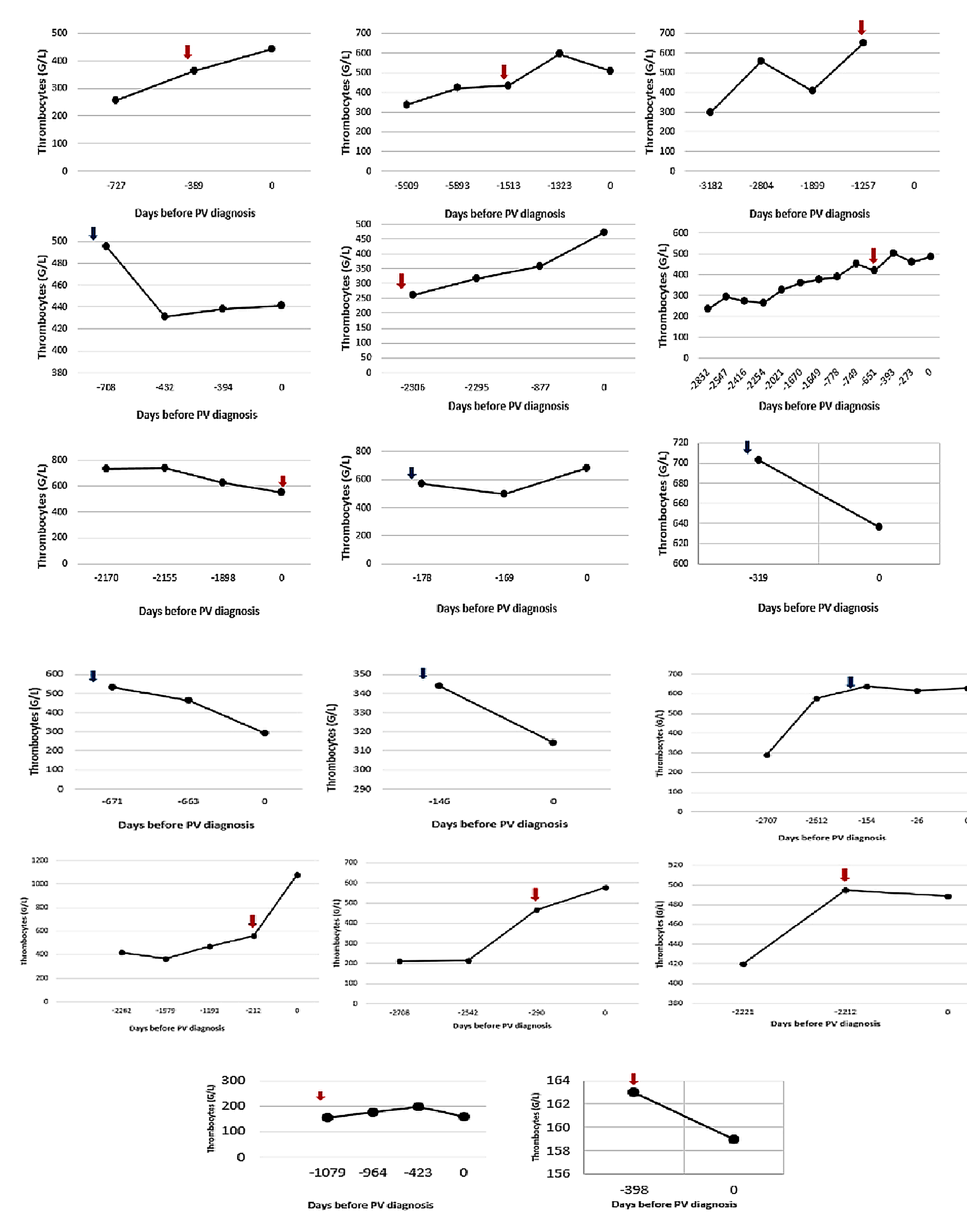 Figure 2Platelet count evolution up to the polycythaemia vera diagnosis in patients with thrombosis before or at the time of polycythaemia vera diagnosis. Blue arrow = venous thromboembolic event. Red arrow = arterial thromboembolic event. Day 0 = Day of polycythaemia vera diagnosis.